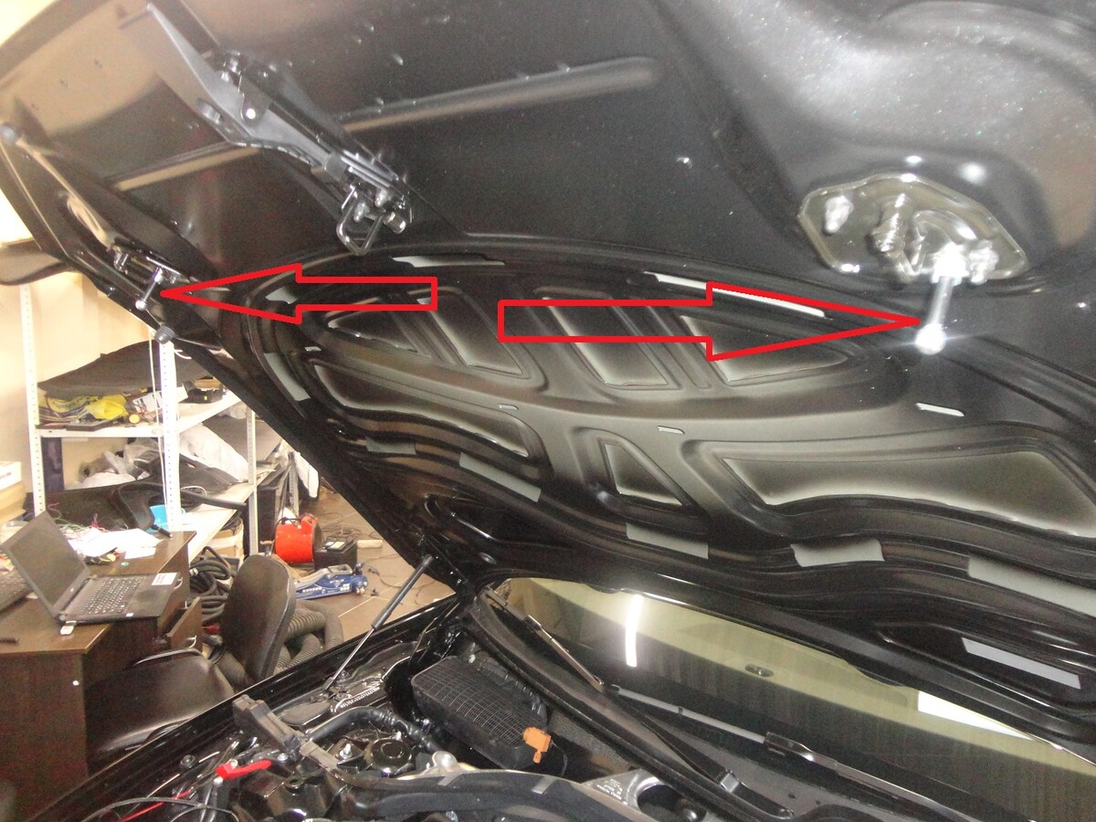 Затем мы защитили само подкапотное пространство от преступного проникновения. Для этого мы установили два электромеханических замка капота. Штыри этих замков мы оборудовали защитой от спиливания и от скручивания, а сами замки управляются сигналайзером.