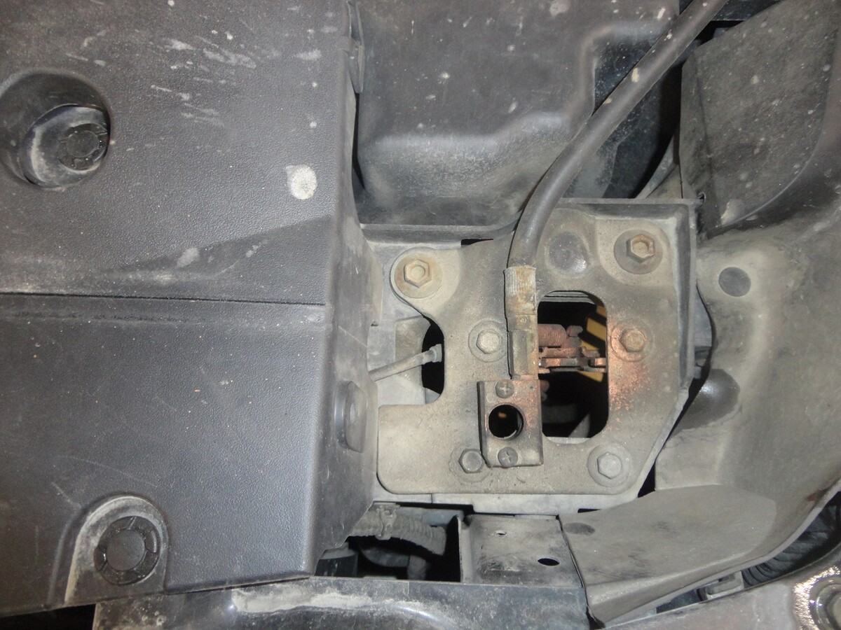 Открыв капот мы заметили повреждения на защите от спиливания. Они обусловлены тем, что штырь правого замка капот не отрегулирован. Таким образом есть вероятность, что замок заклинит и капот не откроется.