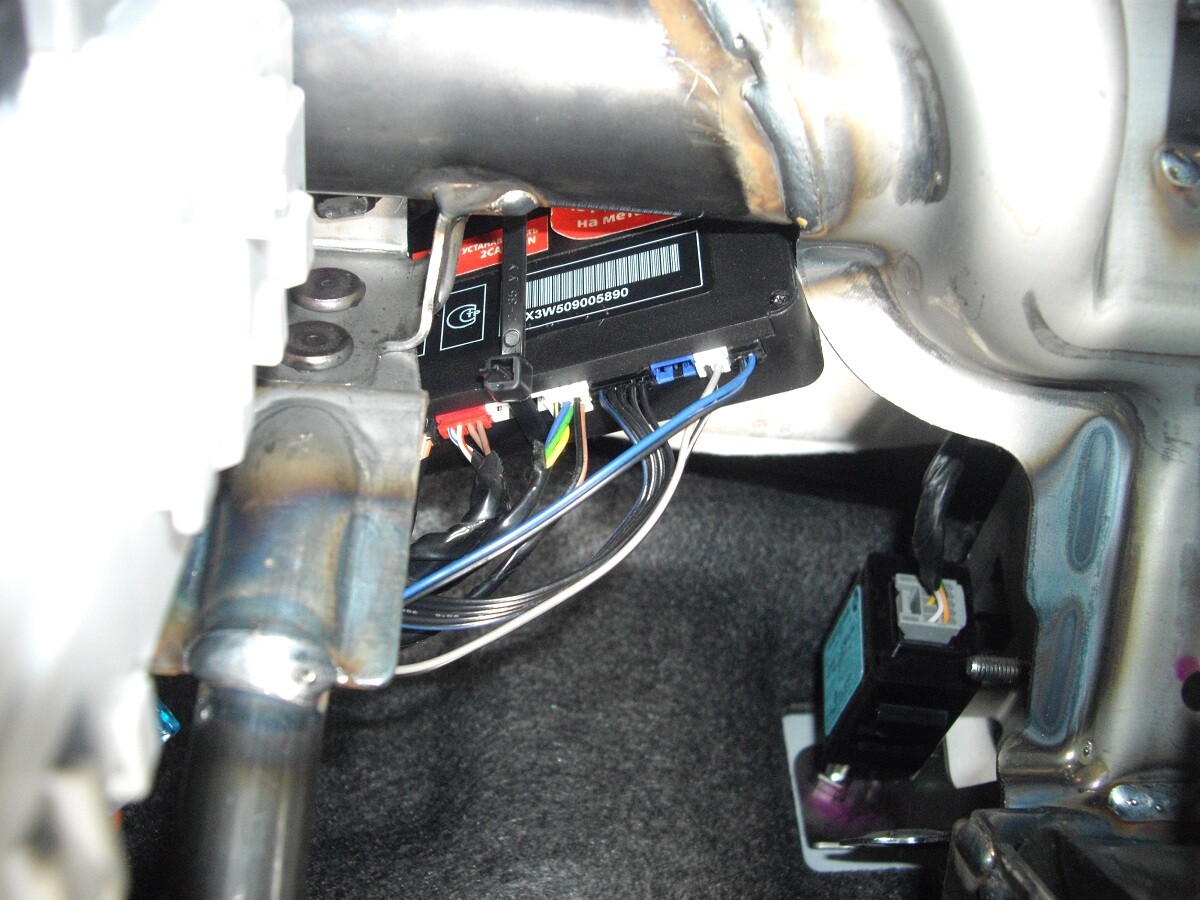 На автомобиле была установлена противоугонная система с обратной связью, но качество монтажа нас неприятно удивило. Головной блок был установлен прямо над педальным узлом, в самом легкодоступном и уязвимом месте. Значит, противоугонная система, установленная таким образом, не создаст помех автоугонщикам.
