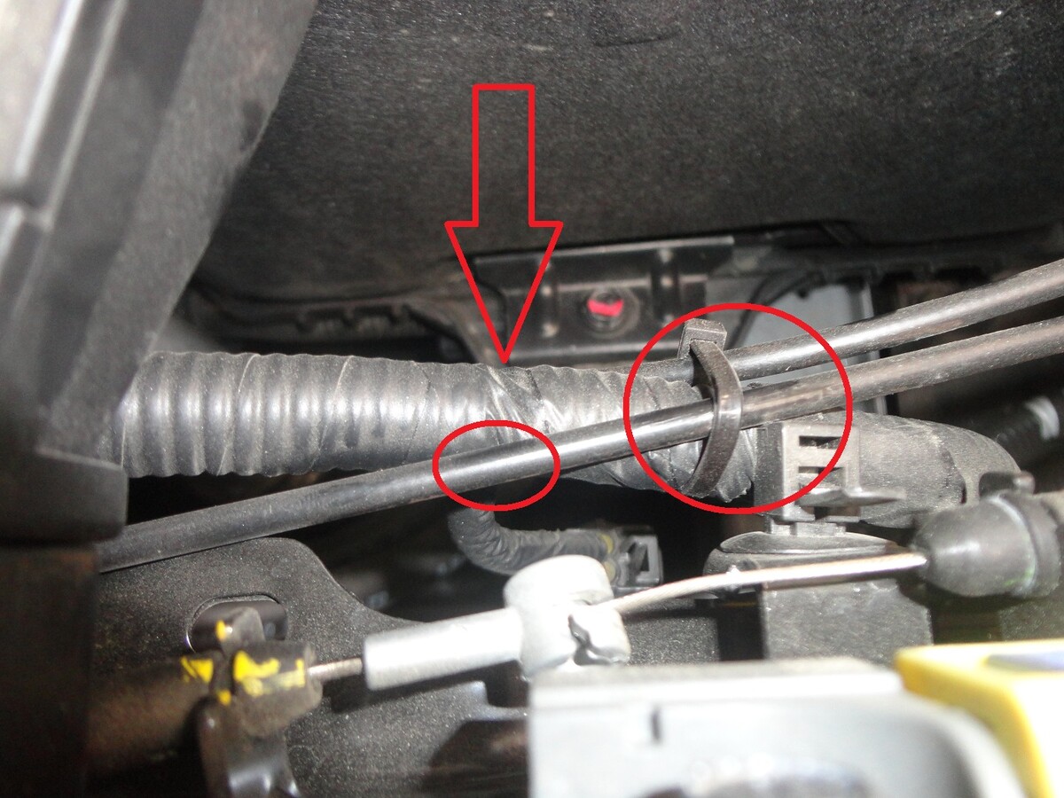 Открыв капот мы увидели не самый удачный способ крепеления тросов замка к штатной проводке. Тросы были притянуты пластиковым хомутом и при закрытии/открытии терлись об обмотку. Да и держалось все, как говорится, "на соплях".