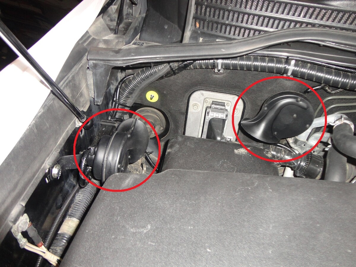 Далее, в глубине подкапотного пространства мы установили комплект очень громких и не стандартных по звучанию звуковых сигнала высокого и низкого тона, которые, в случае срабатывания, точно привлекут к себе внимание окружающих.