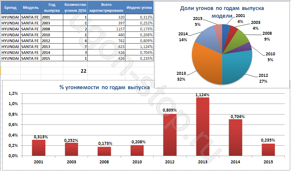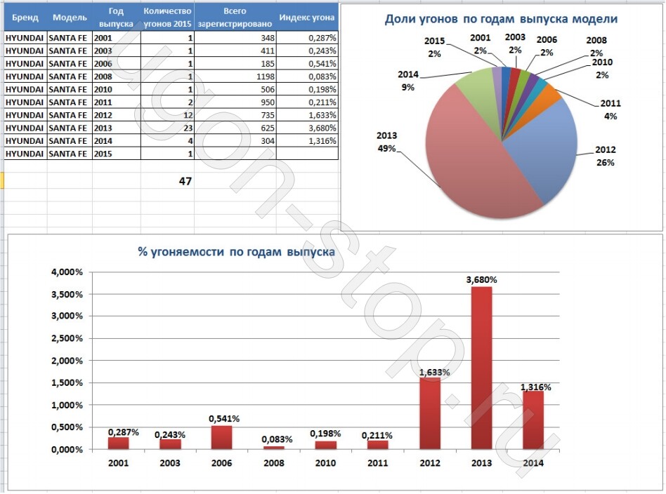 Вот пример одного из наших отчетов по статистике угонов для Hyundai Santa Fe с разбивкой по годам выпуска.